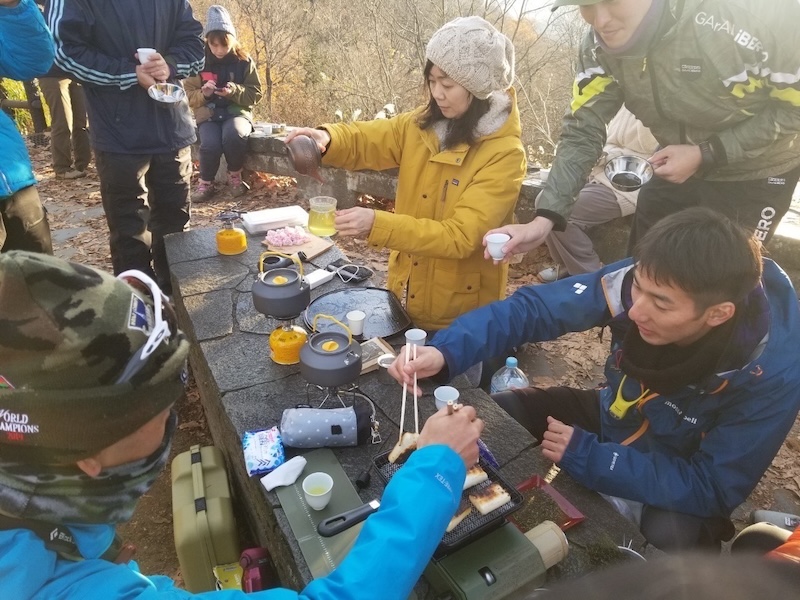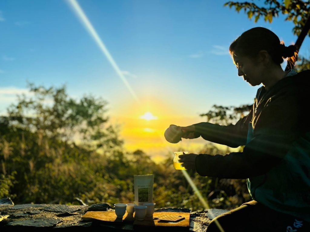 山頂では日本茶を味わい、毎回好評のお茶を使った朝ごはんをみんなで作ります。