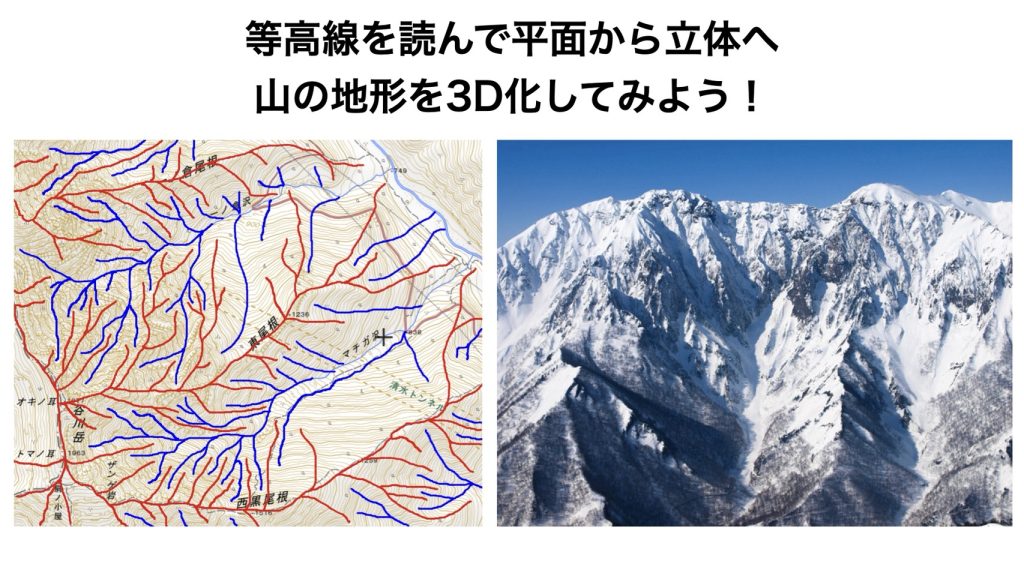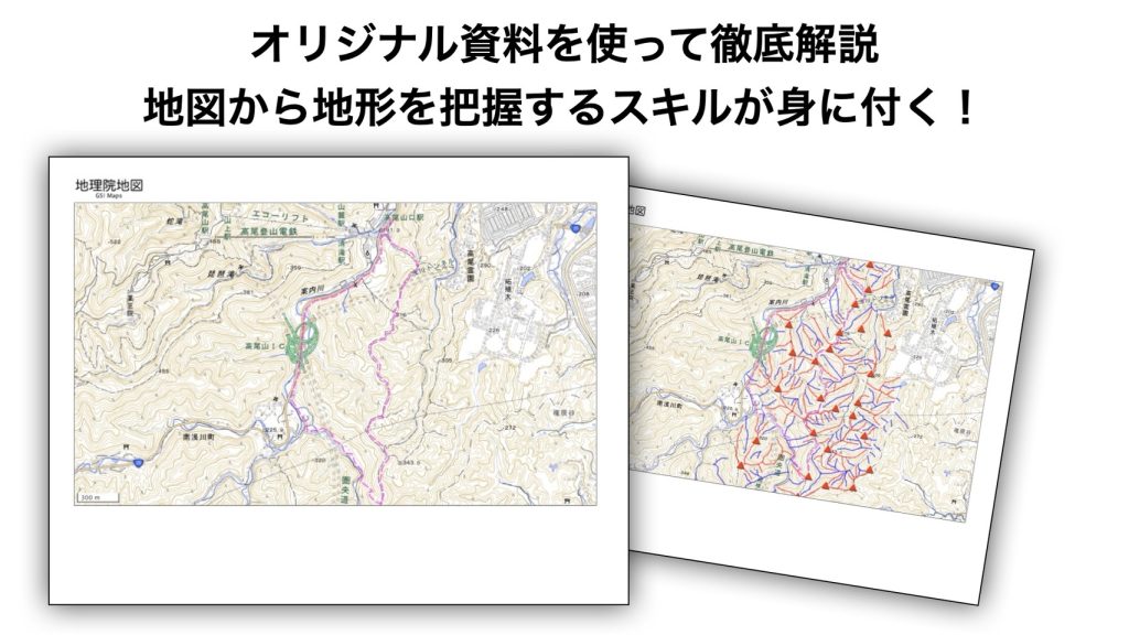 座学で“地形図”に記載された等高線から山の地形を3Dのように可視化し、実習でそのルートをたどることで、地図読みスキルをアップさせましょう!