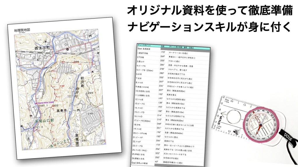 地形図を使った入念な準備が必要なこの“ナビゲーション”。座学でその方法を学び、実習では実際にコンパスを使って登山!1日でそのスキルを習得しましょう。