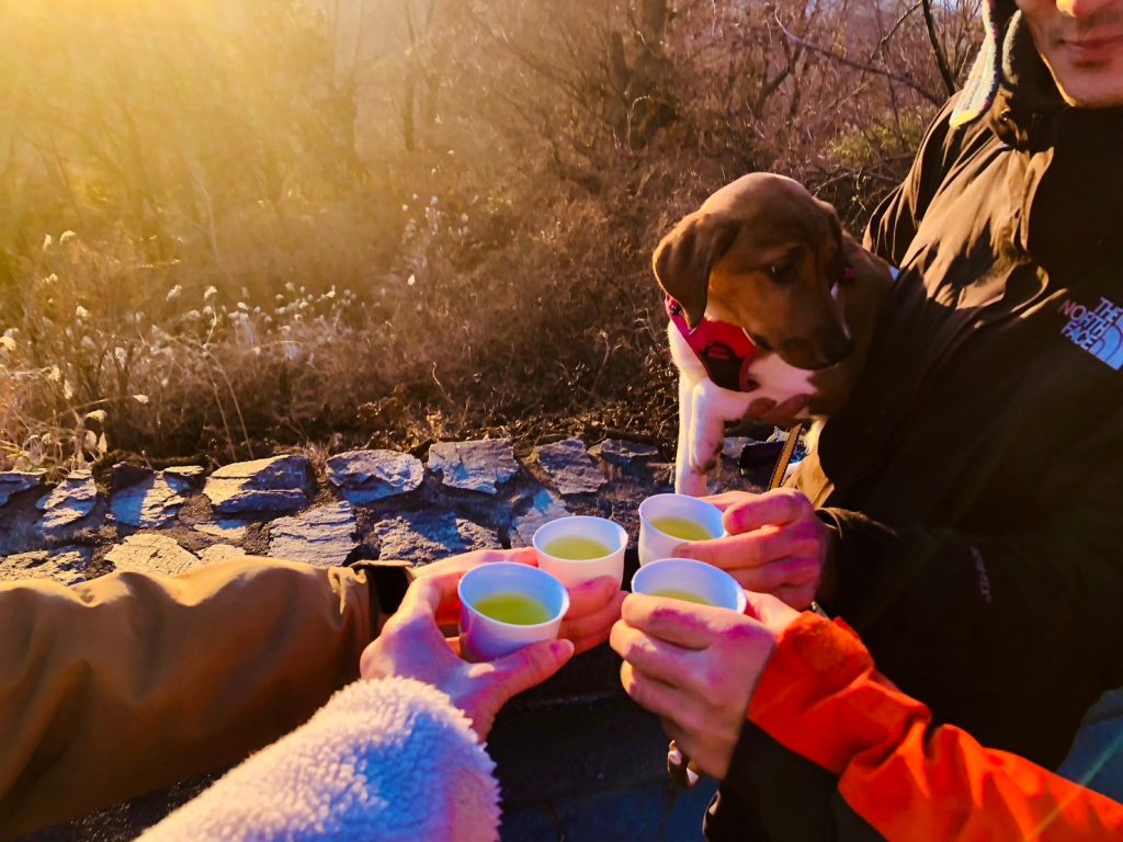山頂では日本茶を味わい、毎回好評のお茶を使った朝ごはんをみんなで作ります。