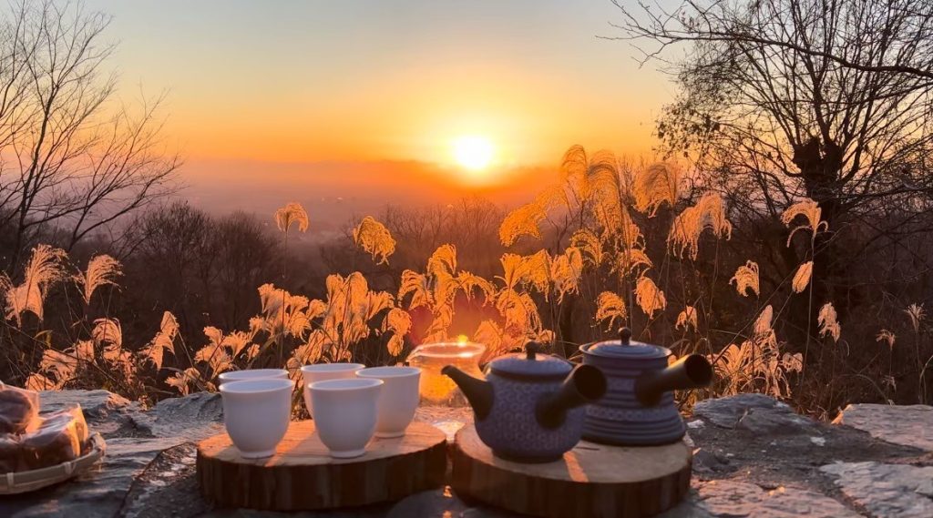 日本茶を片手に、高尾山頂からの美しいご来光を拝み、朝日を浴びて山頂朝ごはん。